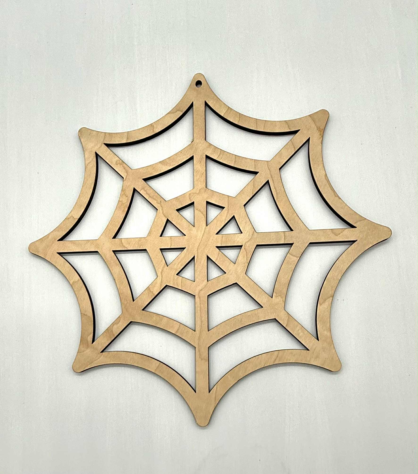 Laser cut from 1/4 inch Birch Wood, this shape can be used as Halloween decor. This shape measures 11 x 11 inches, and has a hole at the top for easy hanging.